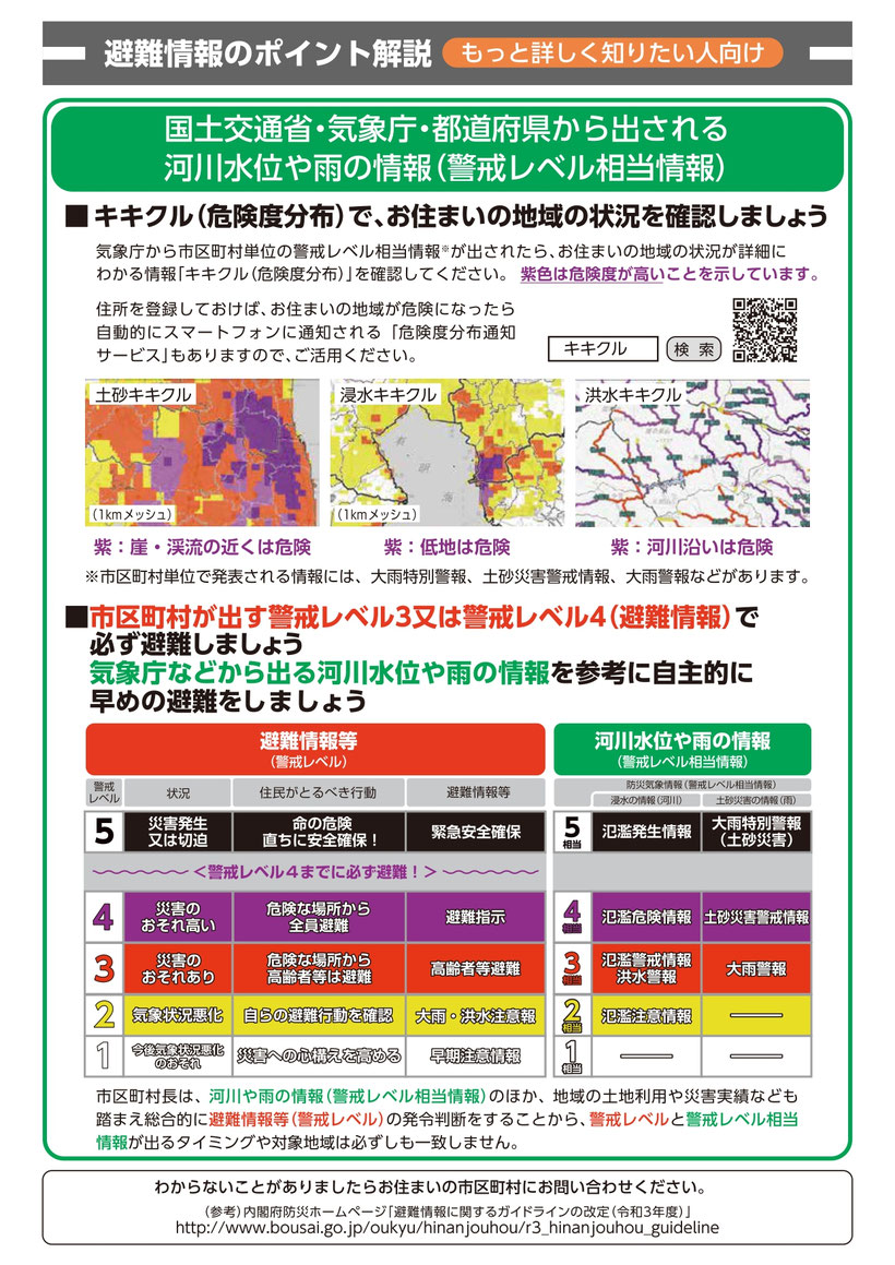 また、主に市区町村から出される「警戒レベル」のほか、気象庁等から出される、河川水位や雨の情報等を警戒度別に分類した「警戒レベル相当情報」もあります。