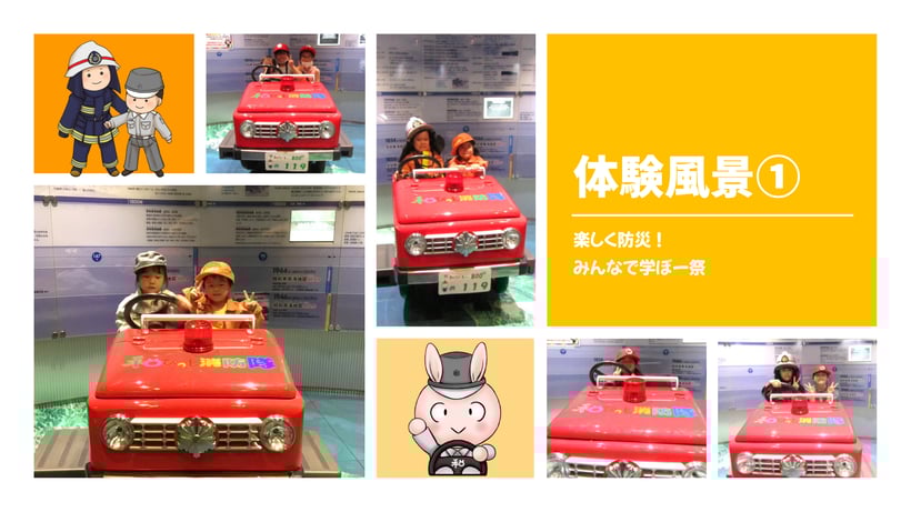 そのほか、多目的学習コーナーでの防火・防災DVD上映や、災害体感シアター、ミニ消防車や顔出し看板で記念撮影、防災グッズの展示コーナー等、防災学習センターの一部コーナーを見学・体験していただきました。