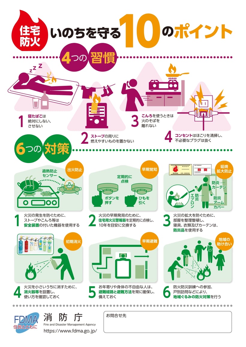 防炎品を使用する、避難経路と避難方法を確保する等、日ごろから心がけて備えておきたい重要なポイントです。