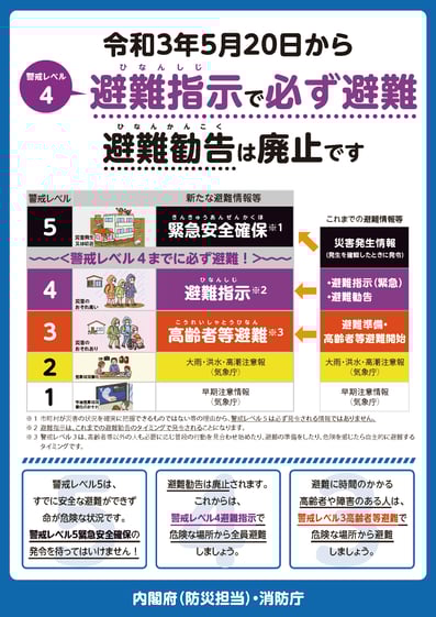令和3年5月に災害対策基本法が改正されたことに伴い、避難情報が新しくなっています。
