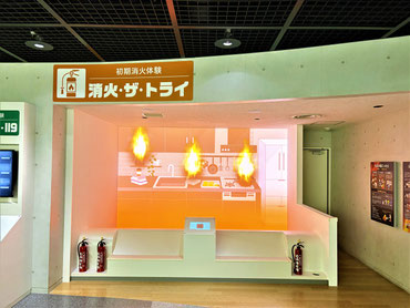 169インチの大迫力画面とセンサー式の模擬消火器で初期消火体験ができます。