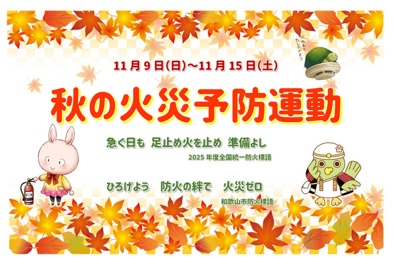 この季節に、防火意識を高めていただくことによって、火災の発生を未然に防ぎ、火災から尊い命と貴重な財産を守ることを目的として、11月9日(日)~11月15日 (土)の1週間、全国各地で「秋の火災予防運動」が実施されます。